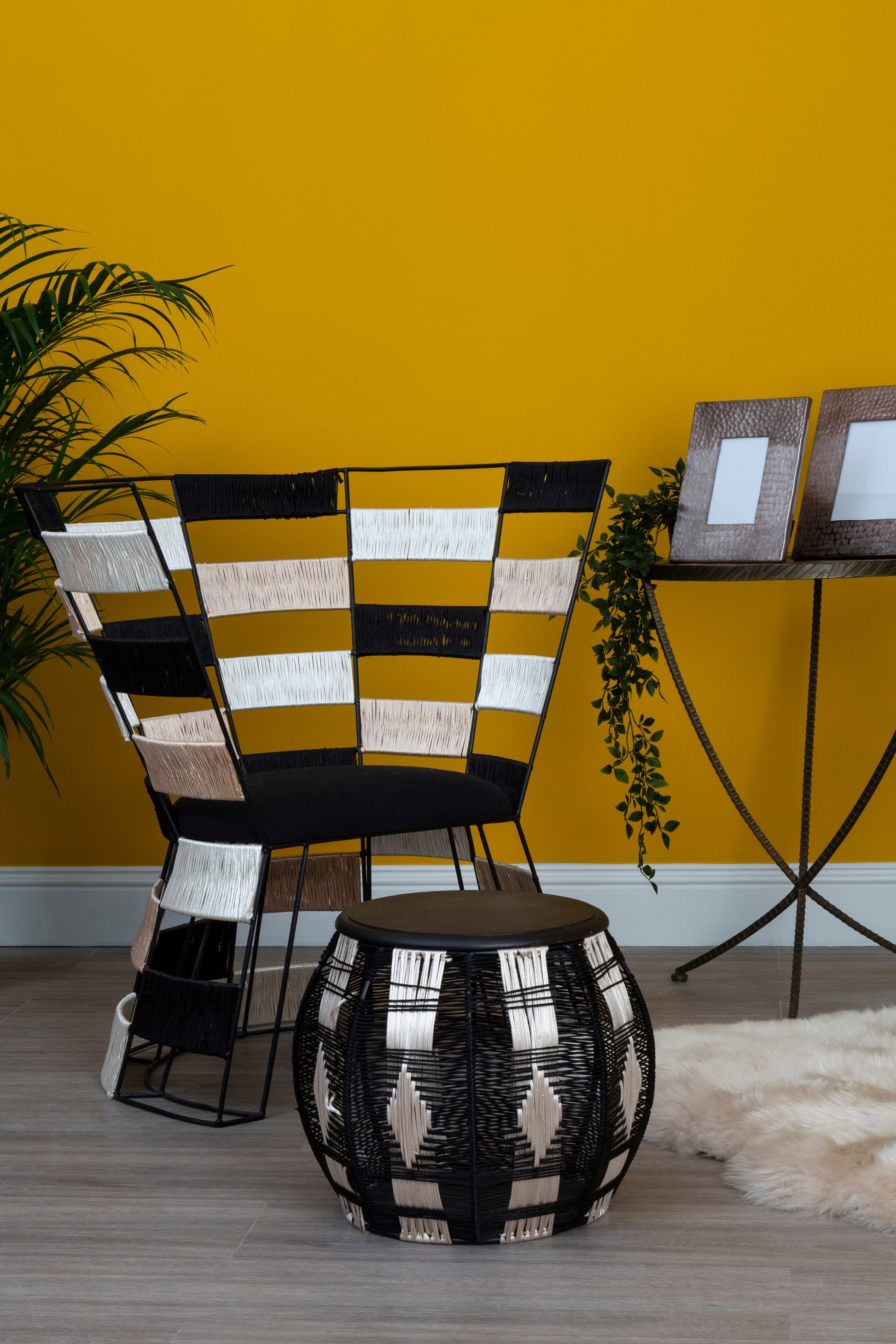 Discover the Lagos fusion chair—a unique blend of style and comfort featuring a distinctive hourglass silhouette and a minimalistic black metal frame. The chair’s padded seat, crafted from dark fabric, offers exceptional comfort while harmonising with the sleek frame. Designed with a grid-like structure, the black frame is skilfully woven with fabric sections, creating a modern checkerboard effect that adds visual interest to any room. Perfect for contemporary and eclectic spaces, this chair combines comfort and artistry in one statement piece.