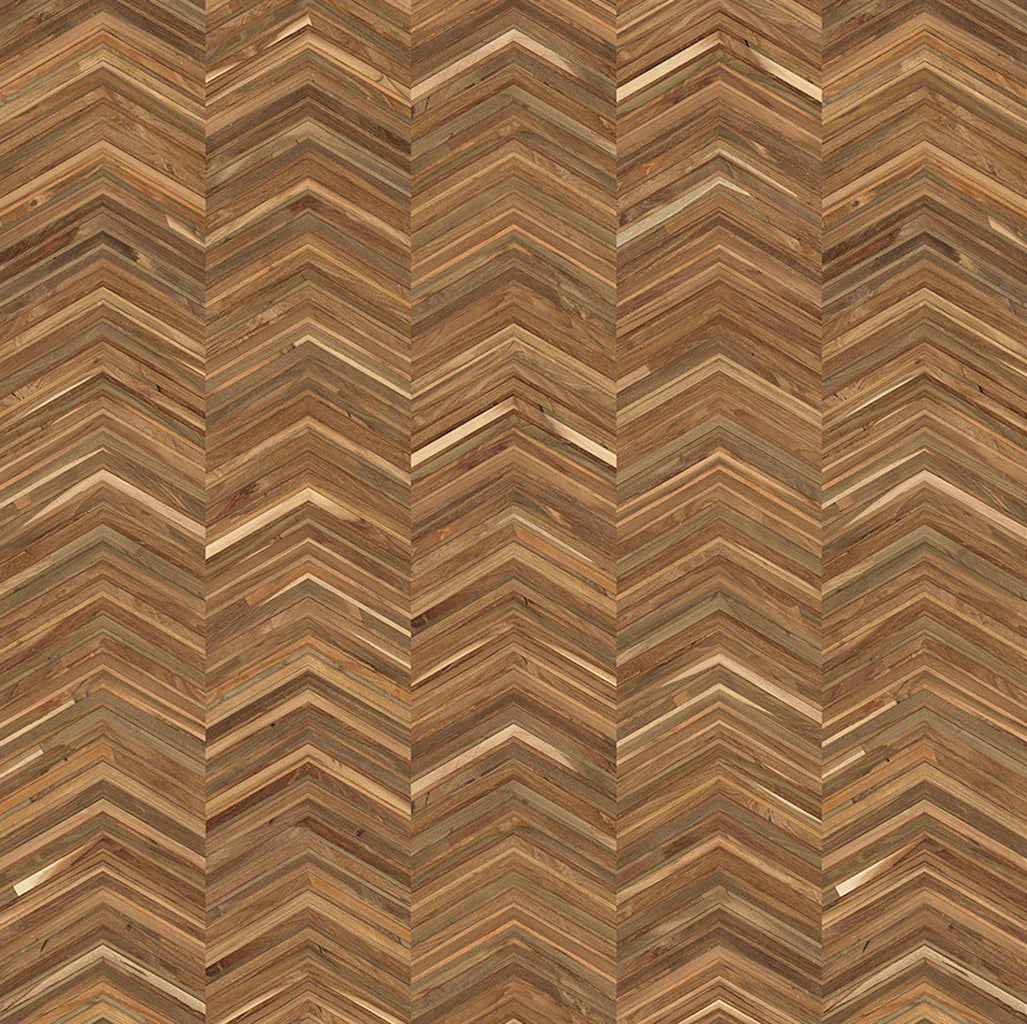 TIM 06 creates warmth and depth using trompe l’oeil wood effect wallpaper with diagonal panels that meet to create V-shaped angle repeats. The effect is one of dynamism, softened by the gentle variations in wood colour.